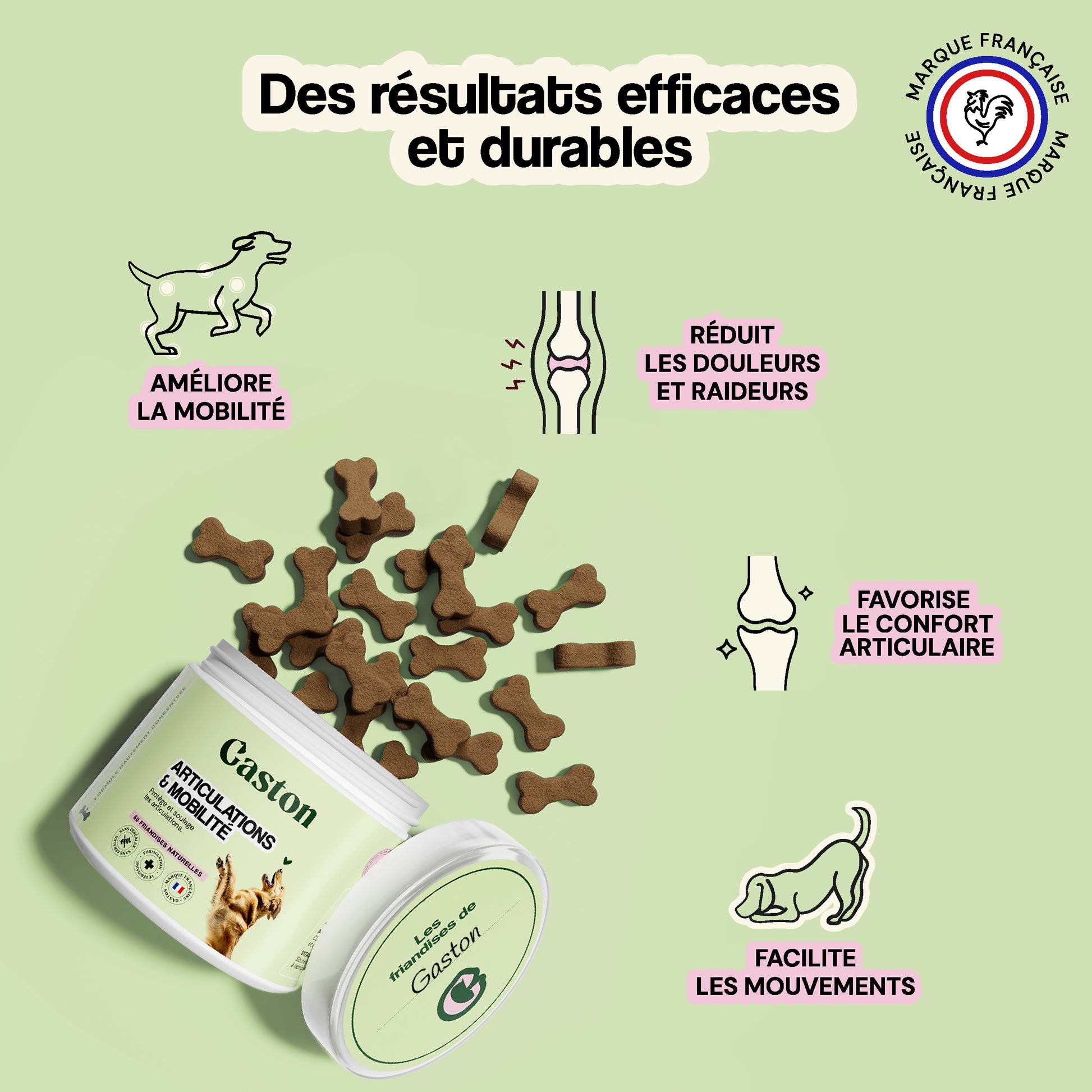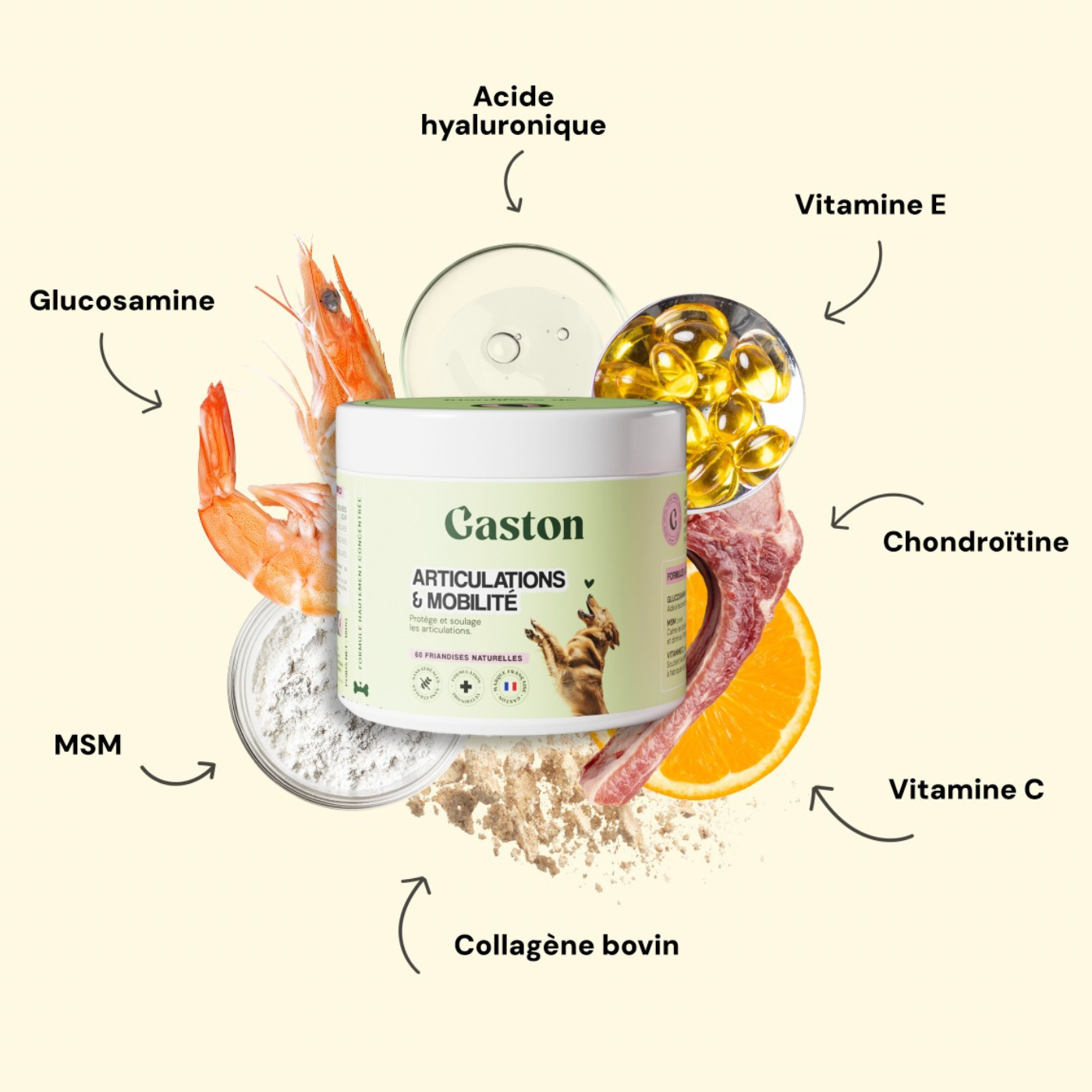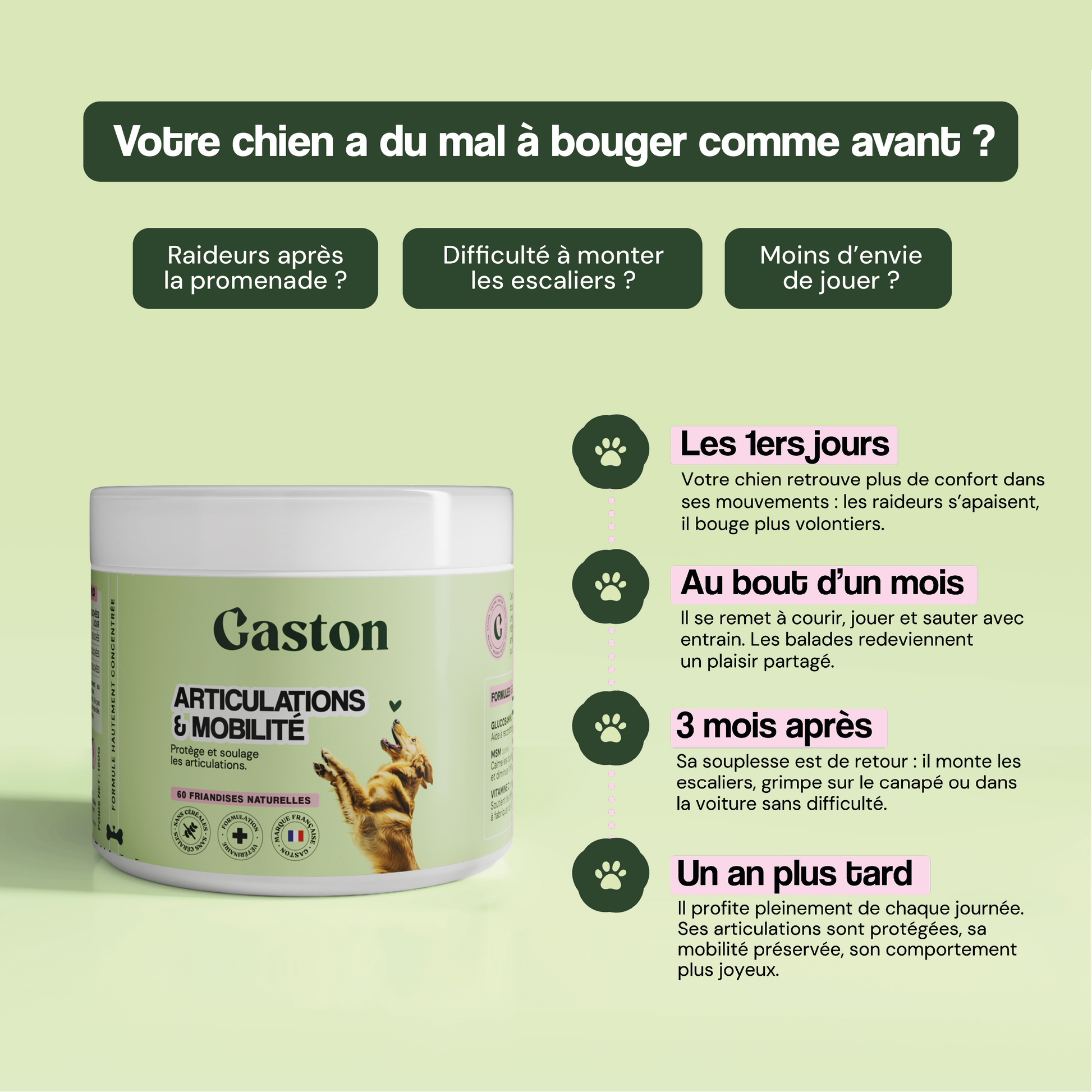Votre chien a du mal à sauter, courir ou même se lever ? Il est peut-être temps de soutenir ses articulations. Gaston Articulations, ce sont de savoureuses bouchées fonctionnelles formulées pour soulager les douleurs articulaires, améliorer la mobilité et renforcer les tissus articulaires jour après jour.