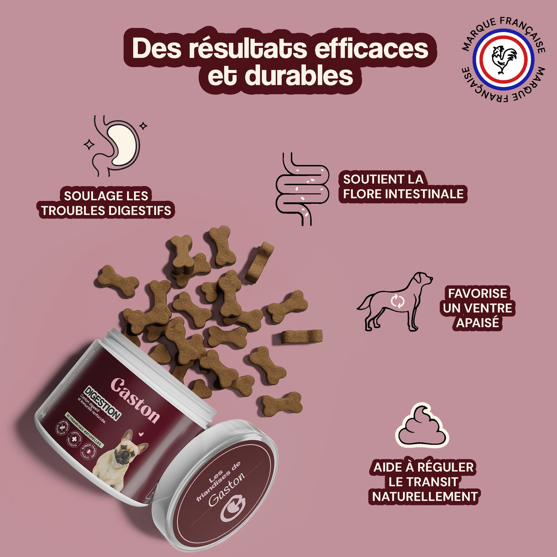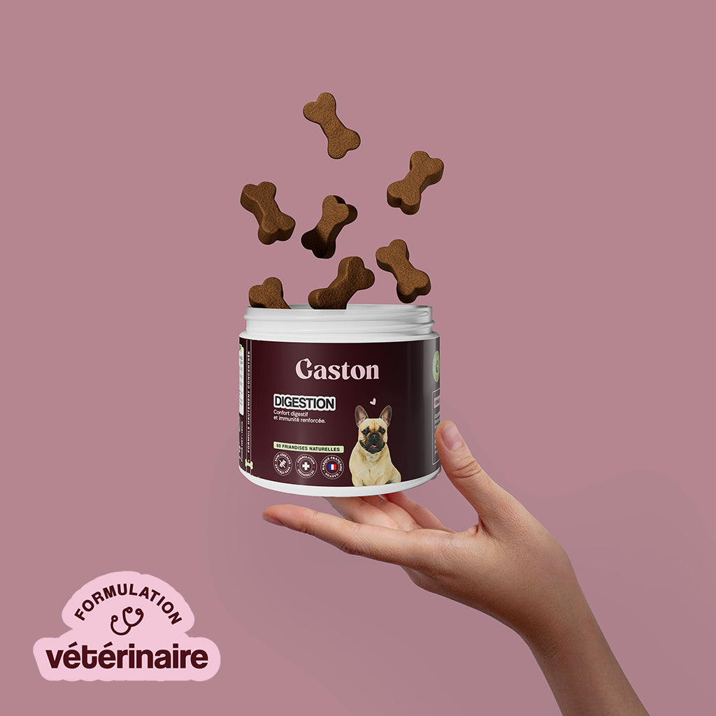 Gaston Digestion est un complément alimentaire naturel sous forme de bouchées savoureuses, spécialement conçu pour soutenir le confort digestif de votre compagnon.